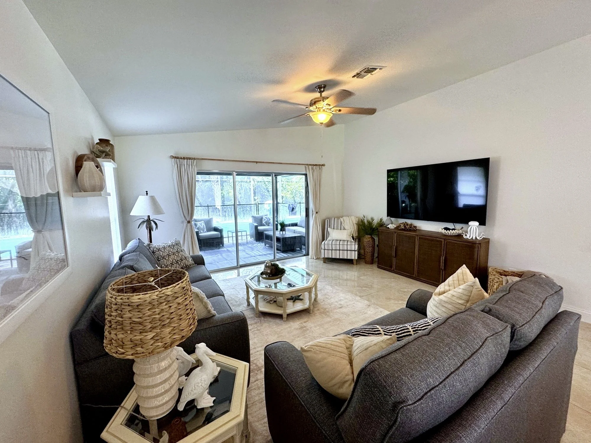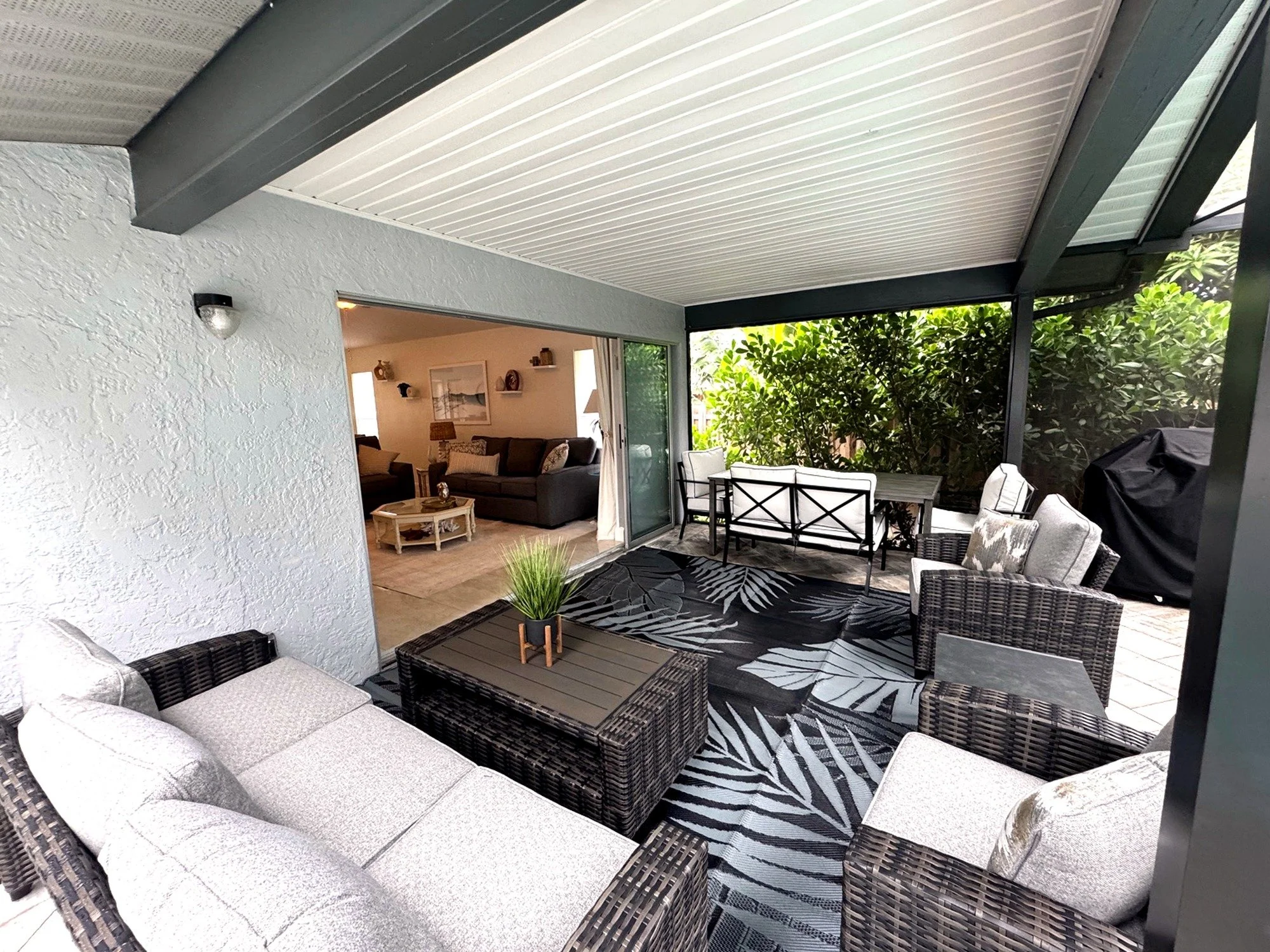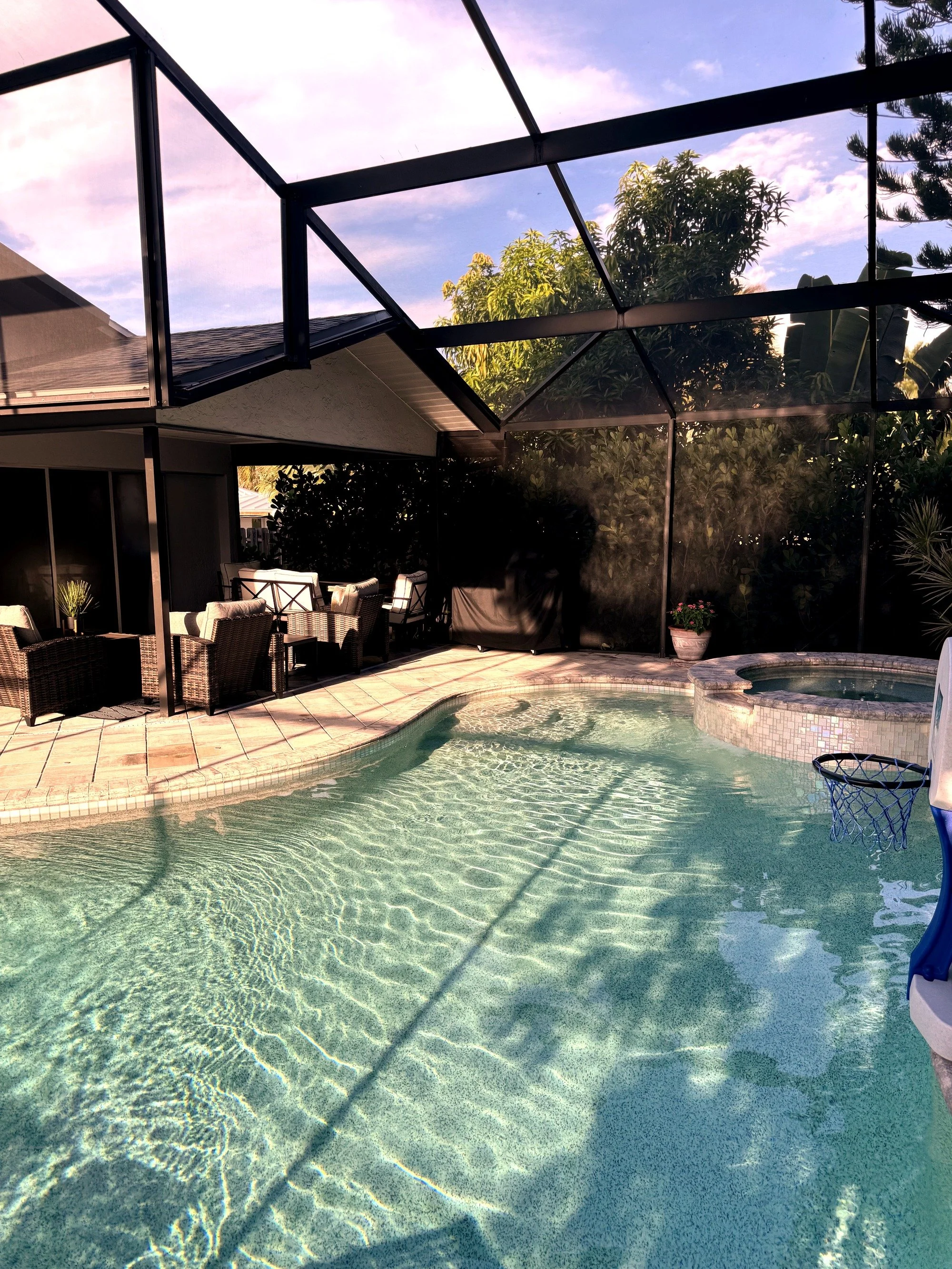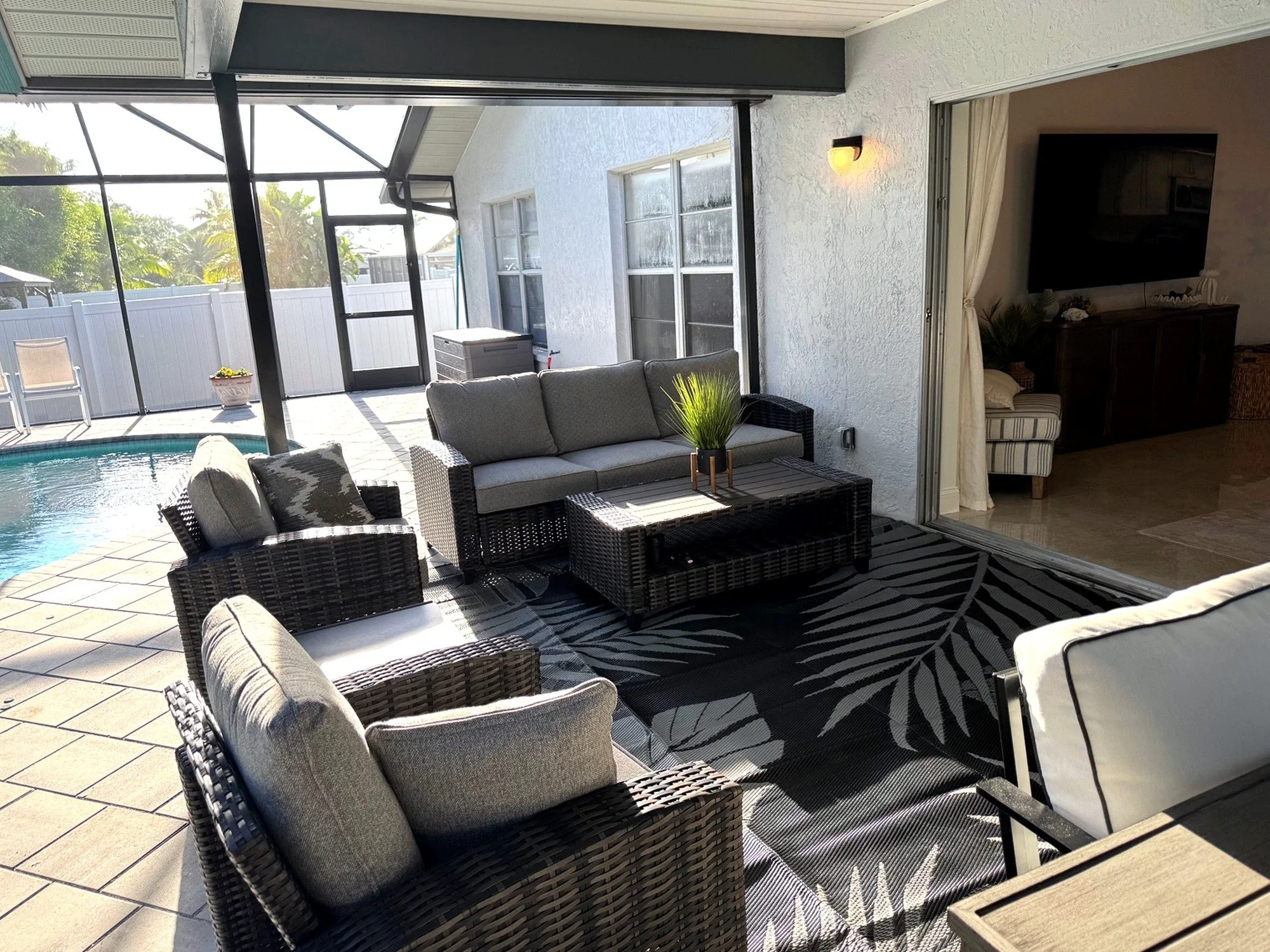 Step outside to your own private tropical oasis. The fully screened and covered lanai opens to a sparkling pool and spa, offering the perfect space to unwind after a day at the beach. Outdoor seating allows for relaxing, dining, or simply enjoying the Florida breeze in peace.