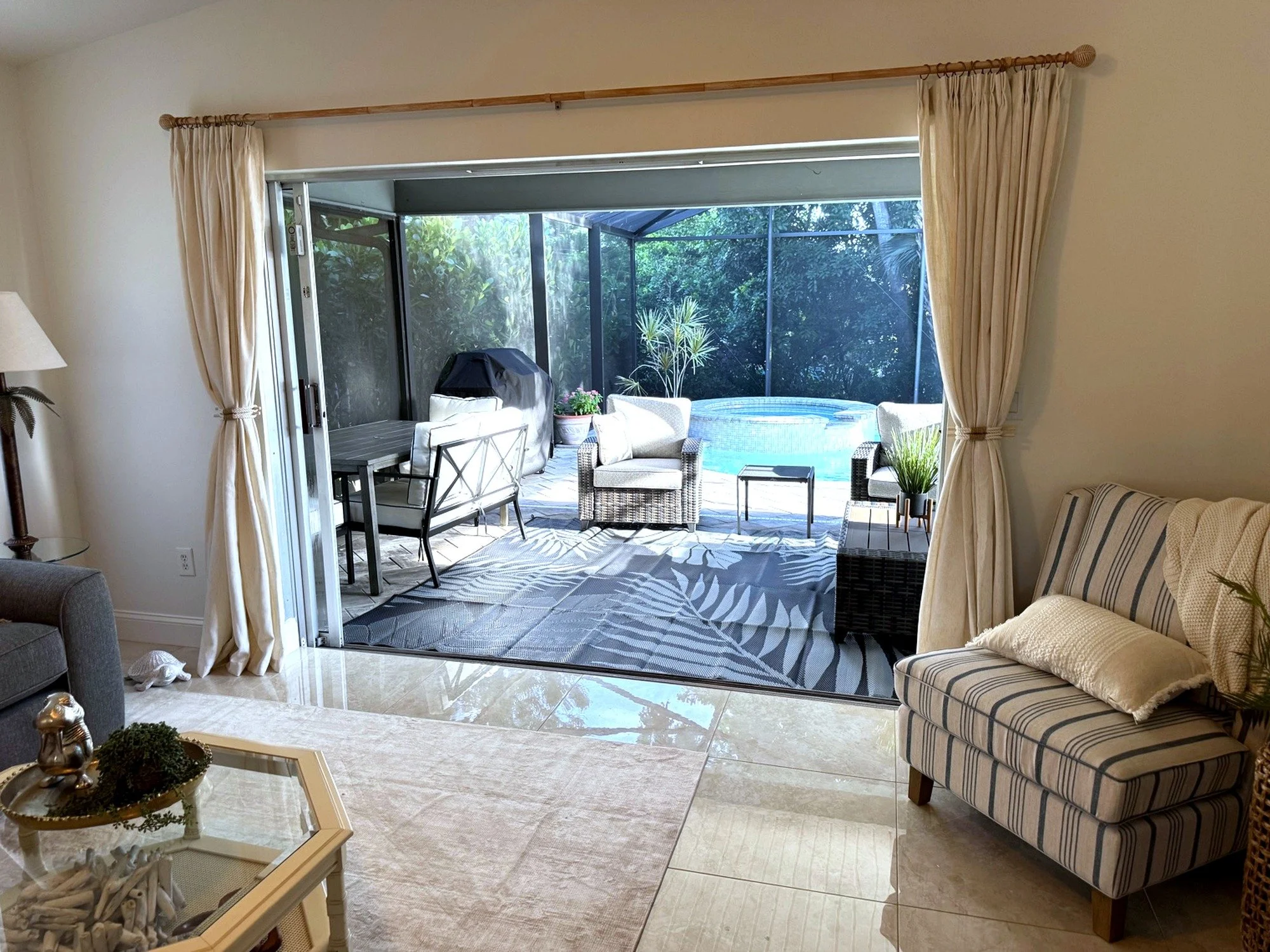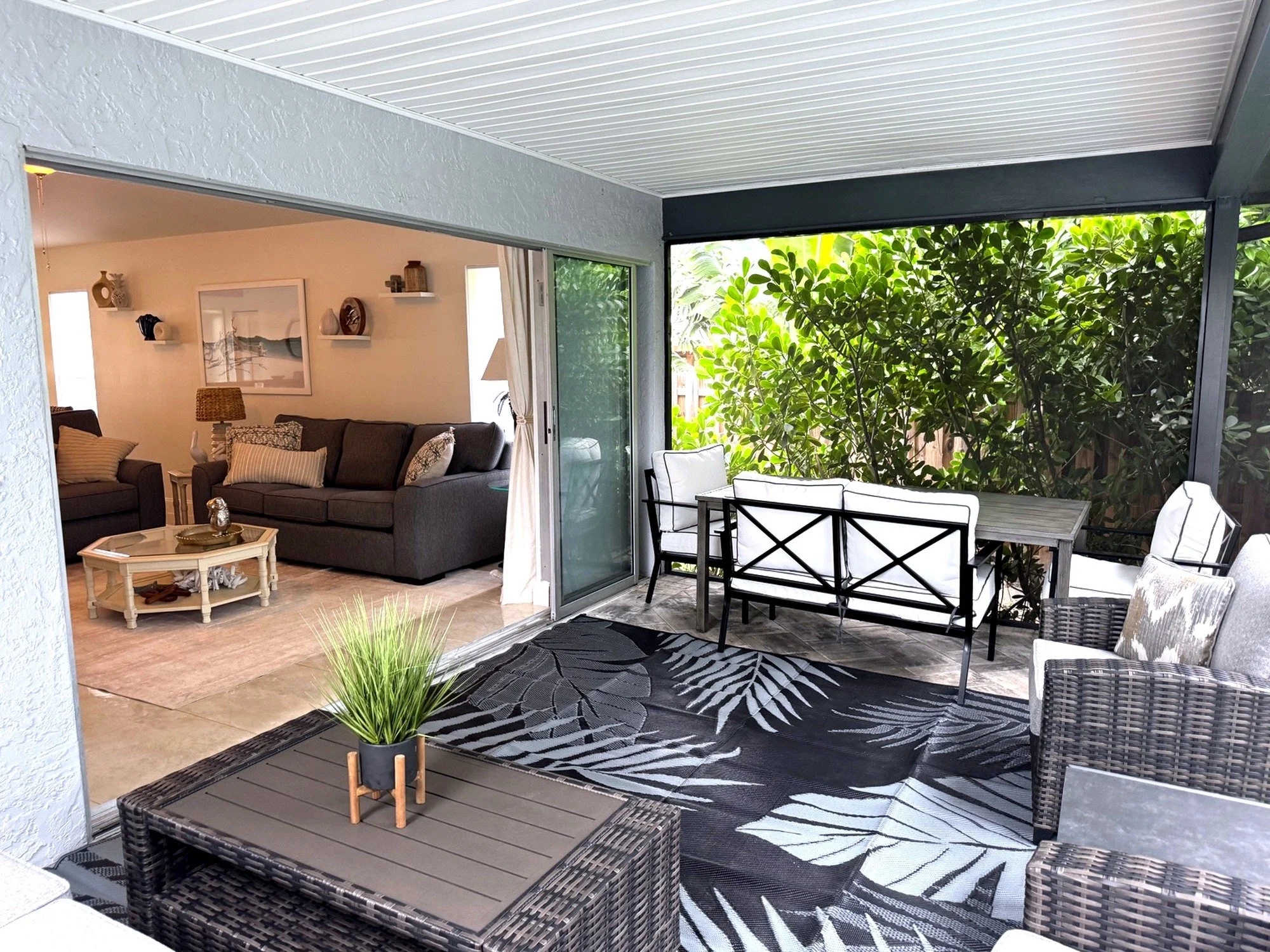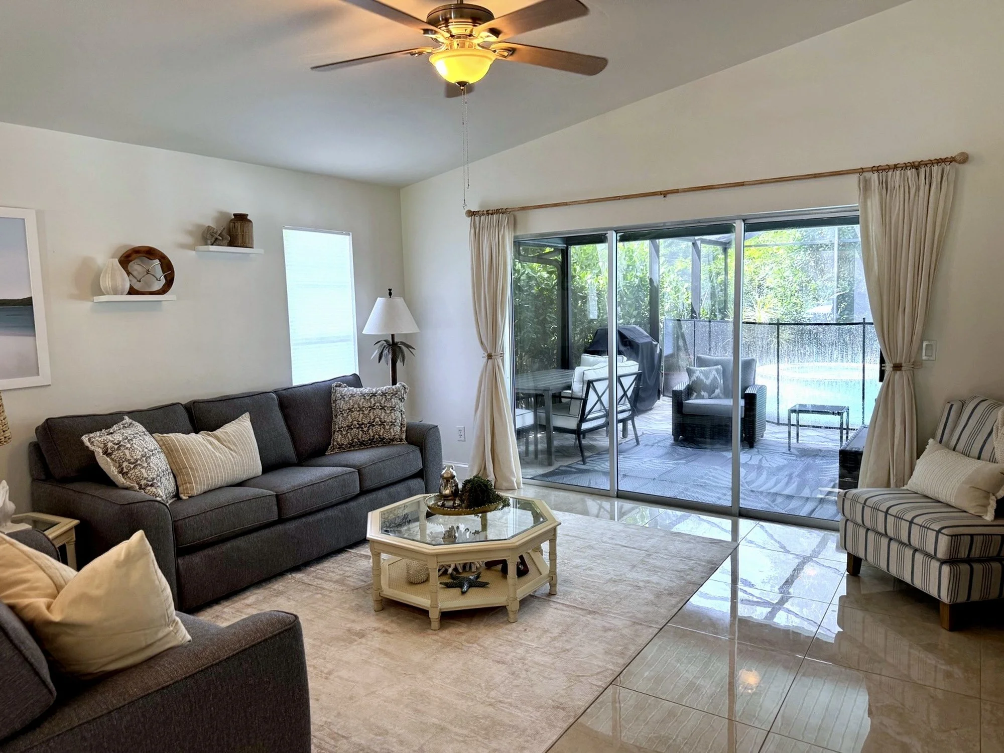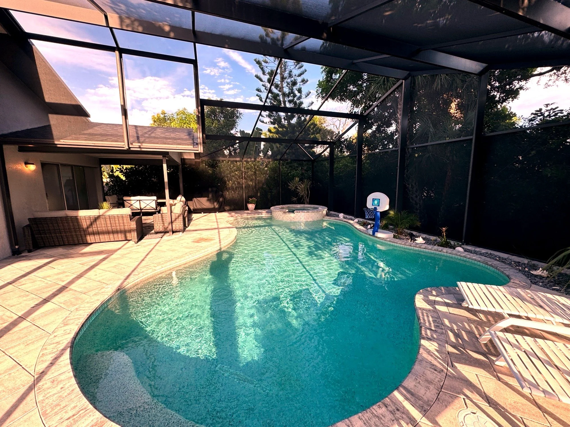 Step outside to your own private tropical oasis. The fully screened and covered lanai opens to a sparkling pool and spa, offering the perfect space to unwind after a day at the beach. Outdoor seating allows for relaxing, dining, or simply enjoying the Florida breeze in peace.