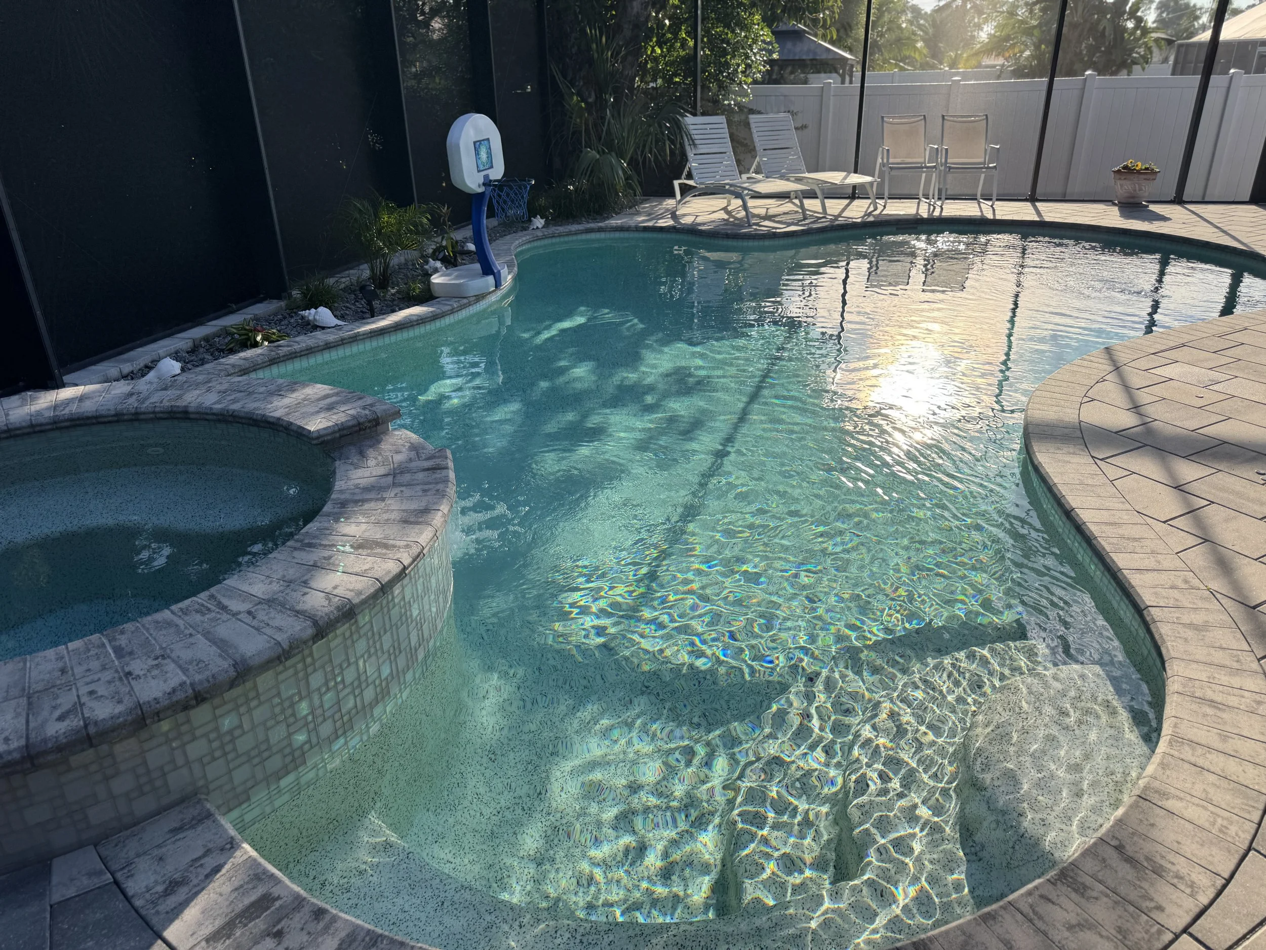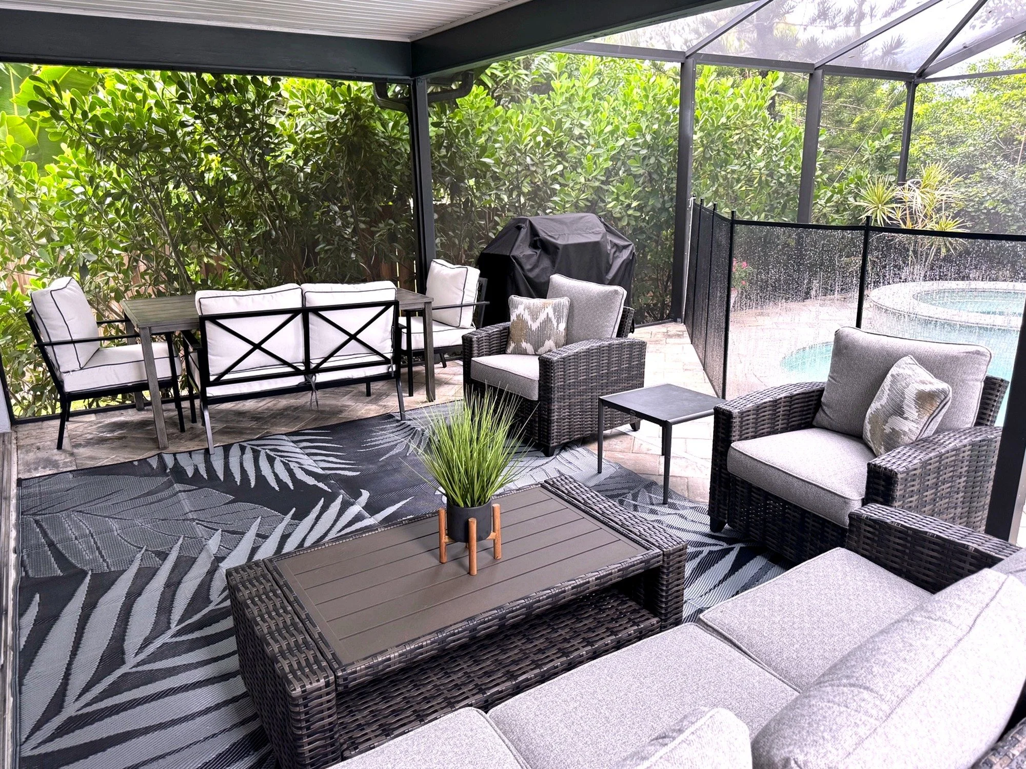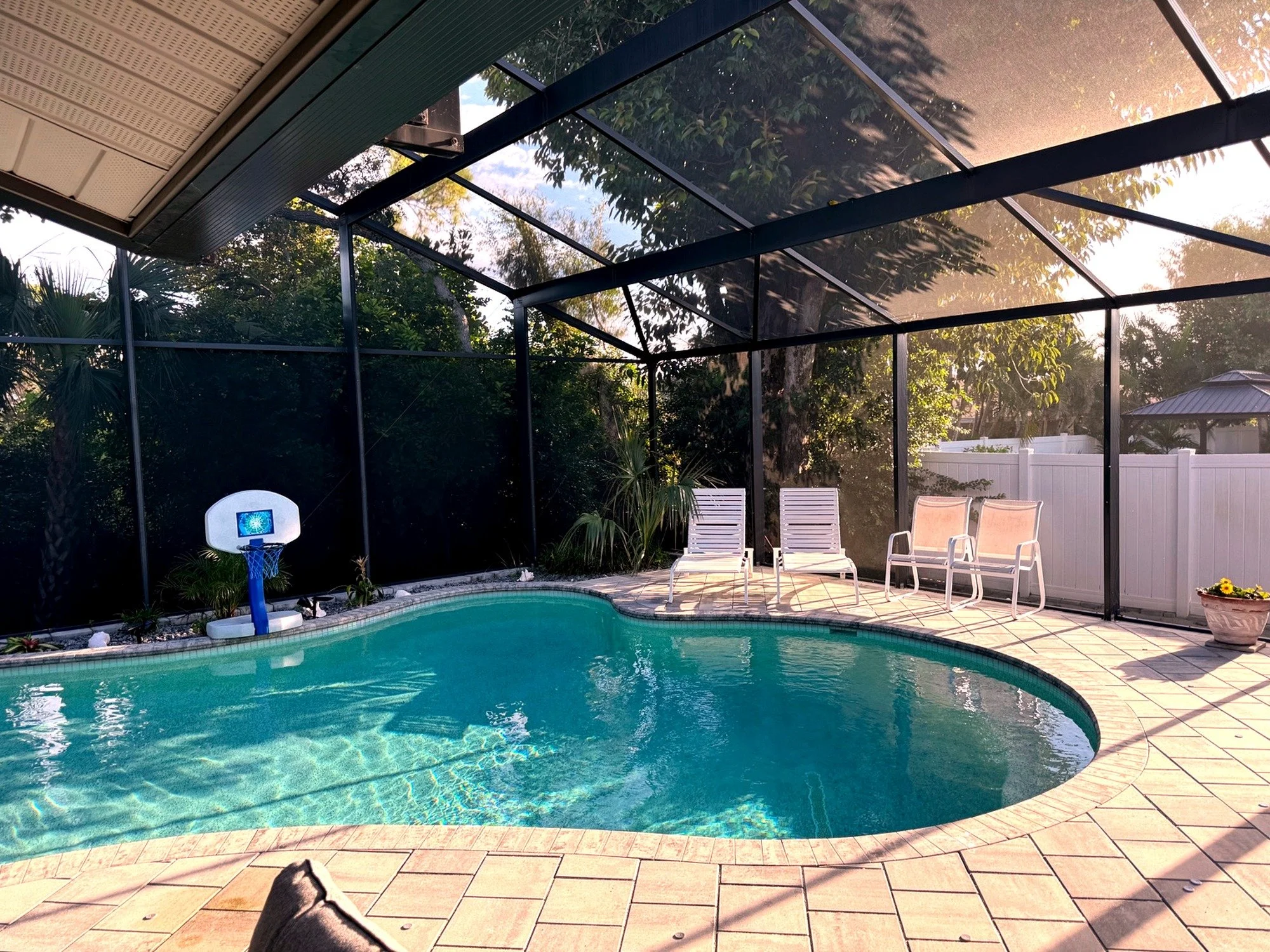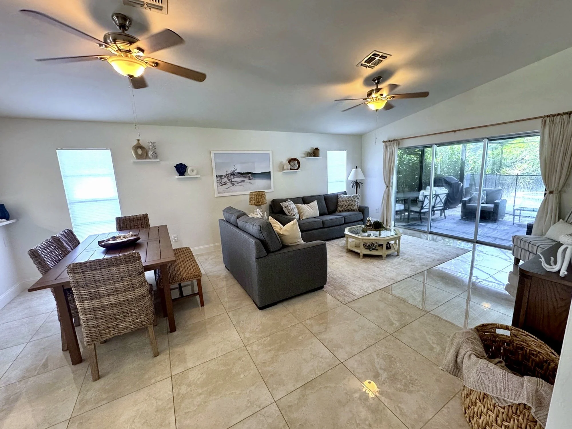 Step outside to your own private tropical oasis. The fully screened and covered lanai opens to a sparkling pool and spa, offering the perfect space to unwind after a day at the beach. Outdoor seating allows for relaxing, dining, or simply enjoying the Florida breeze in peace.