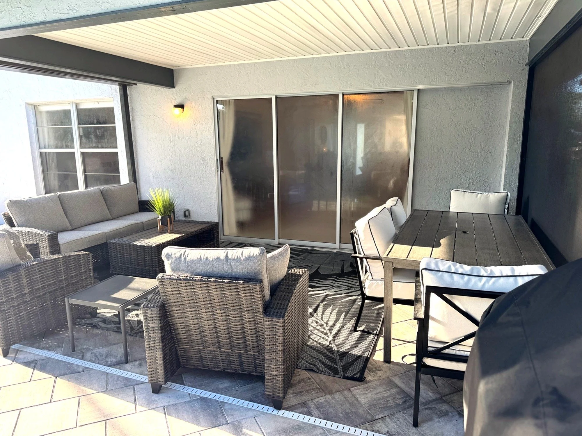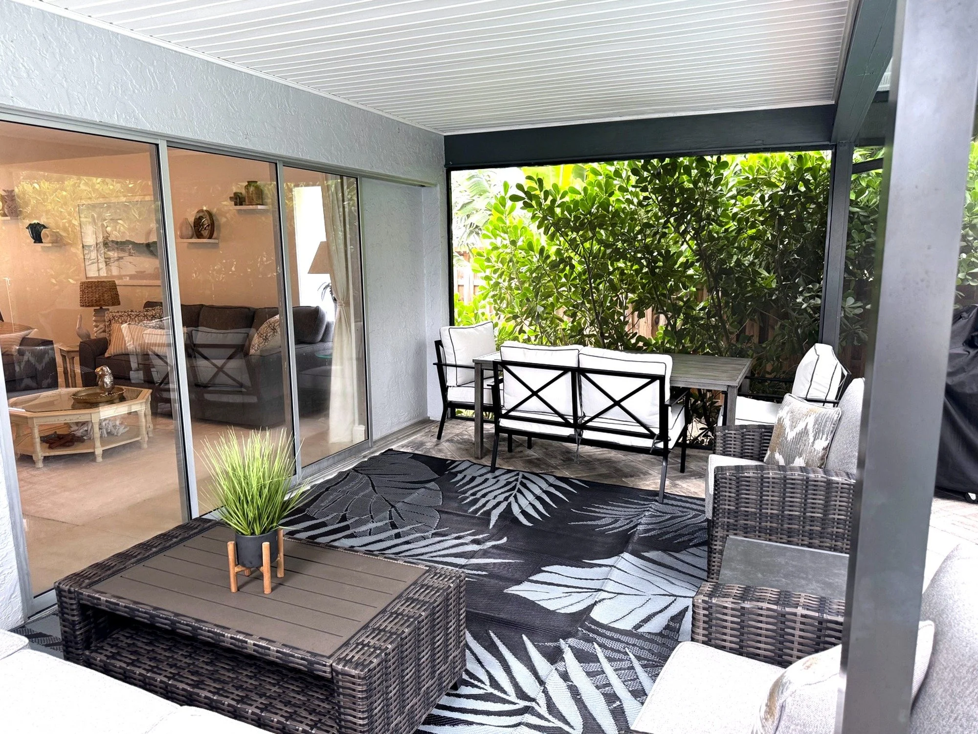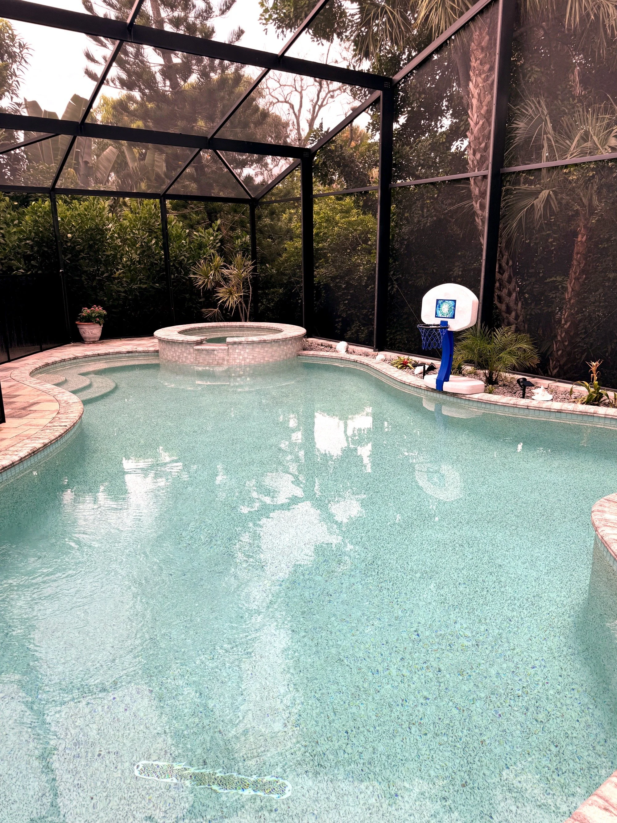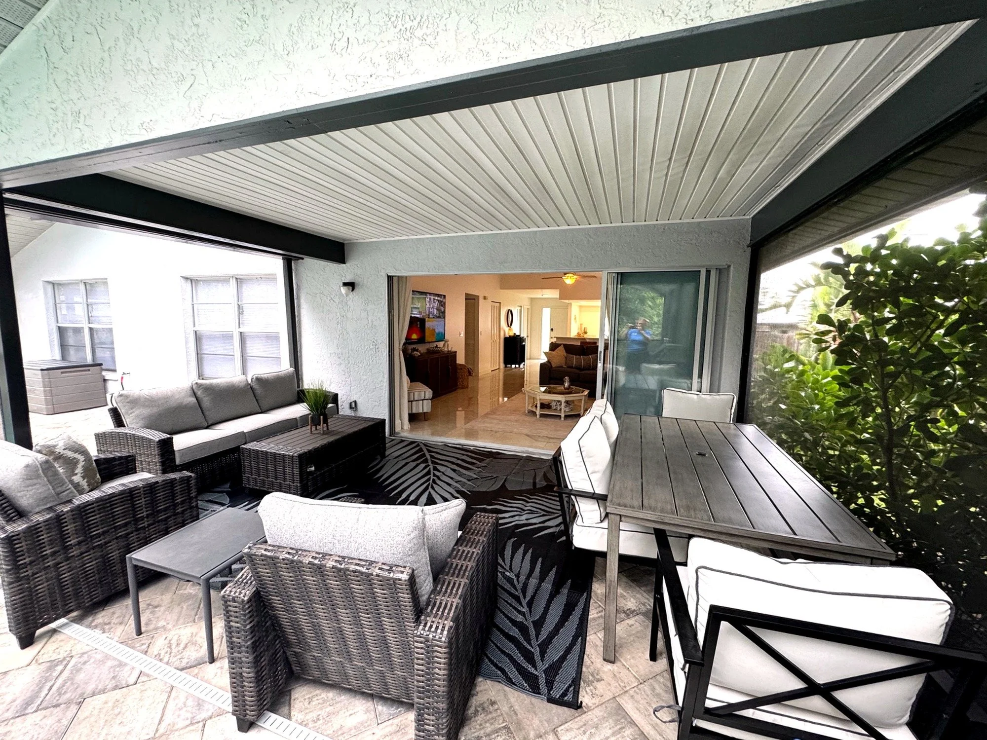 Step outside to your own private tropical oasis. The fully screened and covered lanai opens to a sparkling pool and spa, offering the perfect space to unwind after a day at the beach. Outdoor seating allows for relaxing, dining, or simply enjoying the Florida breeze in peace.