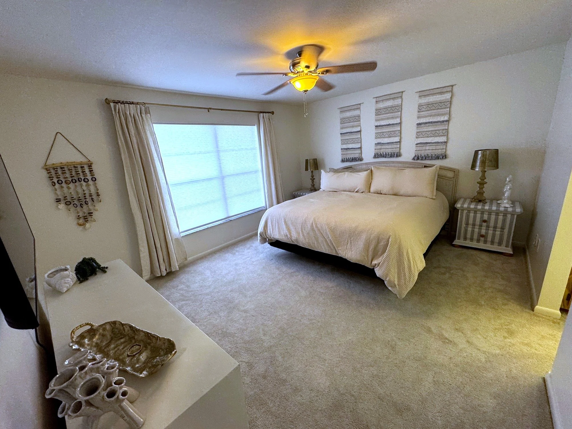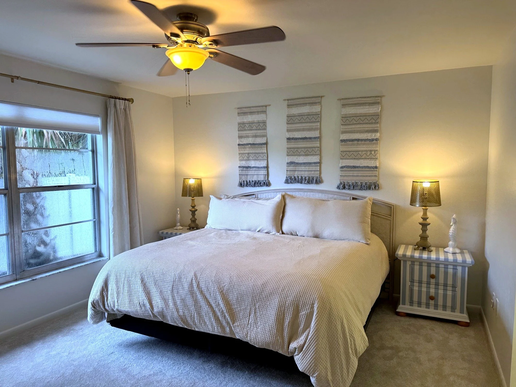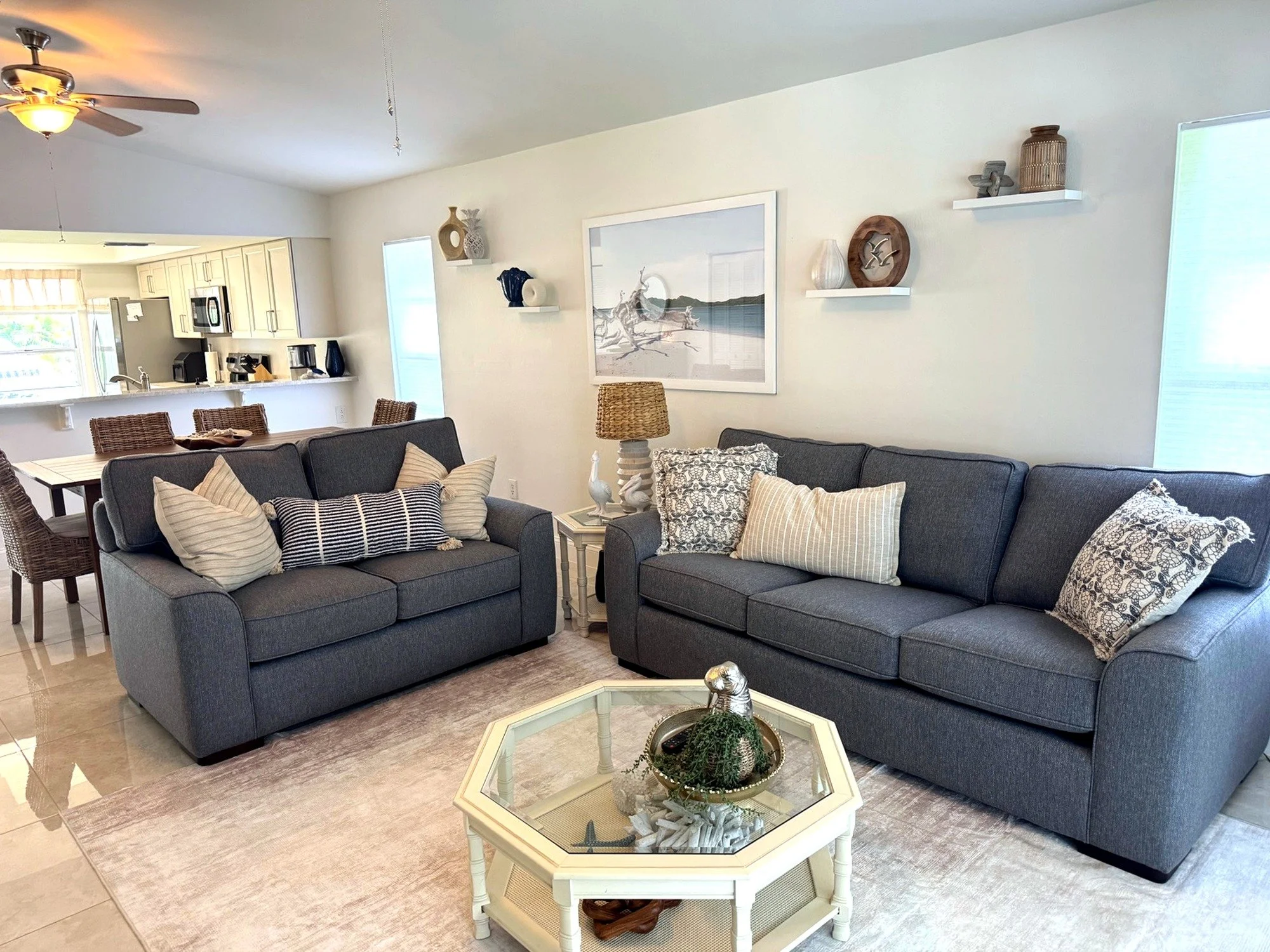 Inside, you'll find a spacious king primary suite with a private en-suite bathroom, a cozy queen bedroom, and a charming twin bedroom with two twin beds, perfect for children or extra guests. The bright and open living room features brand-new furniture and a queen-size pull-out sofa for additional sleeping accommodations. Two full bathrooms are stocked with fresh towels and essentials for your convenience. The fully remodeled kitchen is equipped with modern appliances, cookware, dishes, and a dedicated coffee bar to start your mornings off right. You'll also enjoy high-speed Wi-Fi, a smart TV, central air conditioning, ceiling fans throughout, and an in-unit washer and dryer for added comfort.