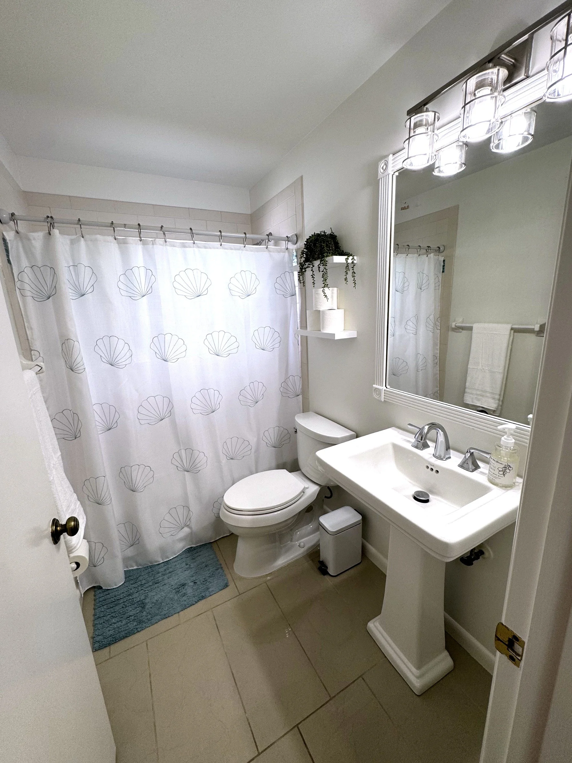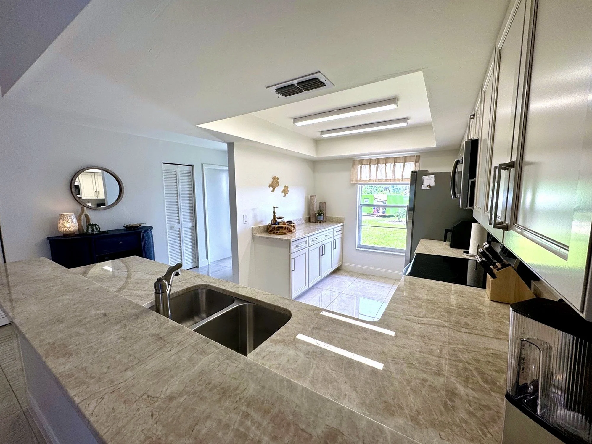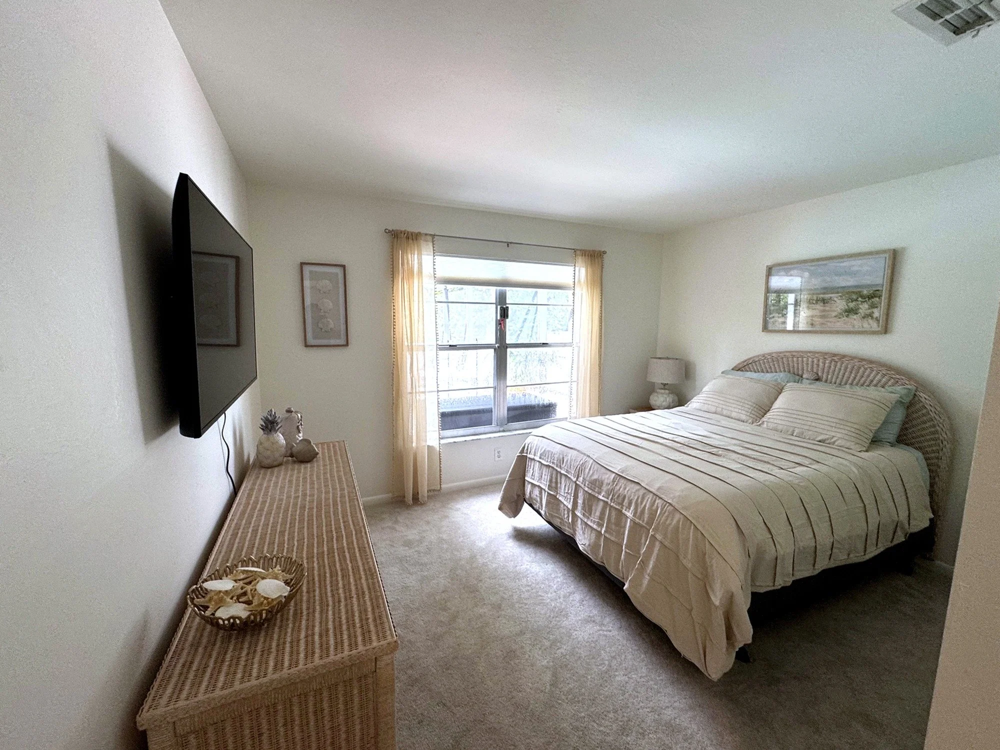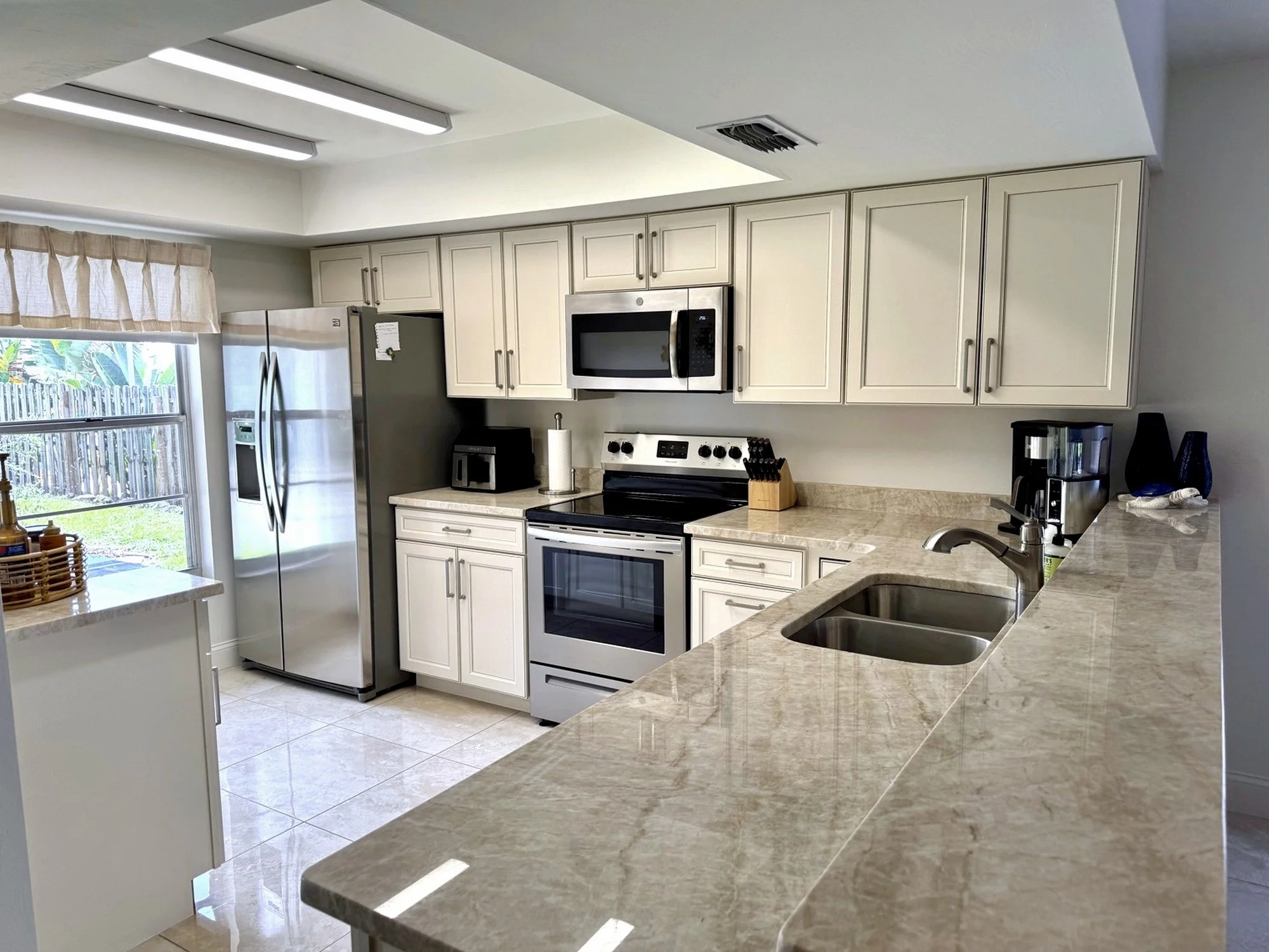 Inside, you'll find a spacious king primary suite with a private en-suite bathroom, a cozy queen bedroom, and a charming twin bedroom with two twin beds, perfect for children or extra guests. The bright and open living room features brand-new furniture and a queen-size pull-out sofa for additional sleeping accommodations. Two full bathrooms are stocked with fresh towels and essentials for your convenience. The fully remodeled kitchen is equipped with modern appliances, cookware, dishes, and a dedicated coffee bar to start your mornings off right. You'll also enjoy high-speed Wi-Fi, a smart TV, central air conditioning, ceiling fans throughout, and an in-unit washer and dryer for added comfort.